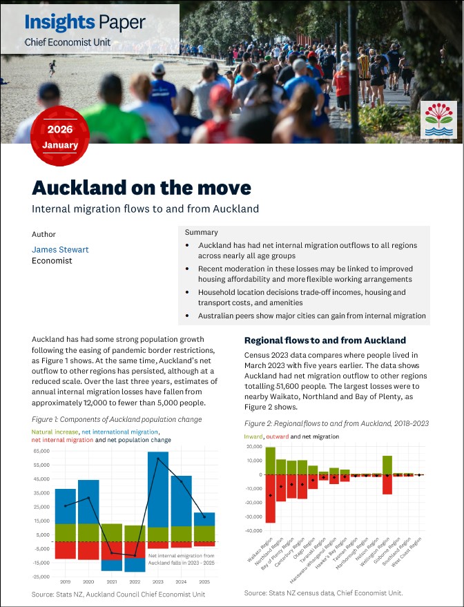This Insights Paper examines recent internal migration flows to and from Auckland. It explores potential drivers behind Auckland’s net migration losses to other regions, why these losses have moderated in recent years, and places Auckland’s experience in the context of large Australian cities.
