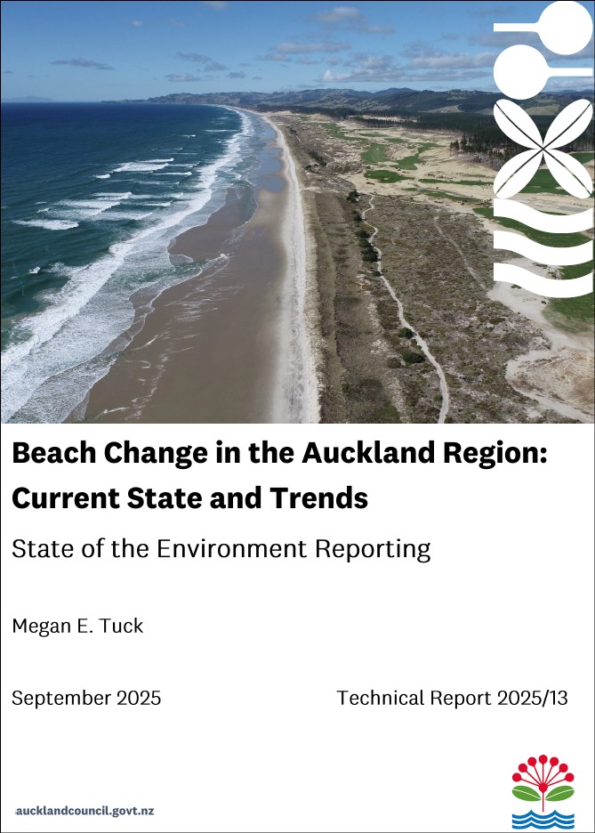 Te Kaunihera o Tāmaki Makaurau / Auckland Council’s Coastal Processes Monitoring Programme provides essential long-term information on coastal change across the region. The programme has been monitoring coastal change at key beaches across Tāmaki Makaurau since the 1960s. Through the regular and long-term collection of beach profile surveys, the programme provides valuable data on erosion and accretion rates, which supports our understanding of natural coastal dynamics, informs adaptation planning, and enables effective management responses to coastal hazards and climate change. This report provides detailed beach profile analyses of 12 beaches, with beaches categorised into four groups (west coast, open east coast, inner Hauraki Gulf, and Tāmaki Strait) representing distinct wave climates around Tāmaki Makaurau. The analysis evaluates long- and short-term beach state and trends by assessing variations in beach envelope, beach volume, beach width, and for certain beaches, dune dynamics and beach rotation. Several important patterns emerge providing valuable insights into our region’s dynamic coastlines.
