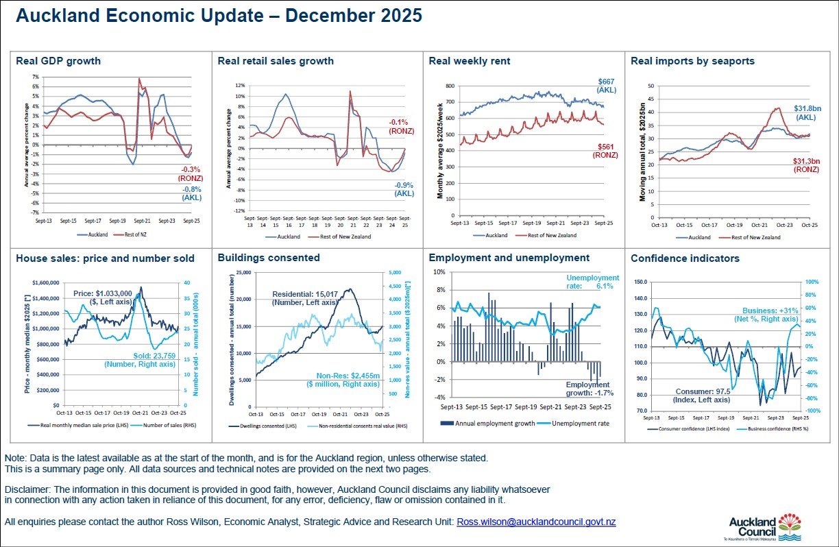 EconomyAn overview of the Auckland economy for December 2025, in charts and graphs and with some commentary.