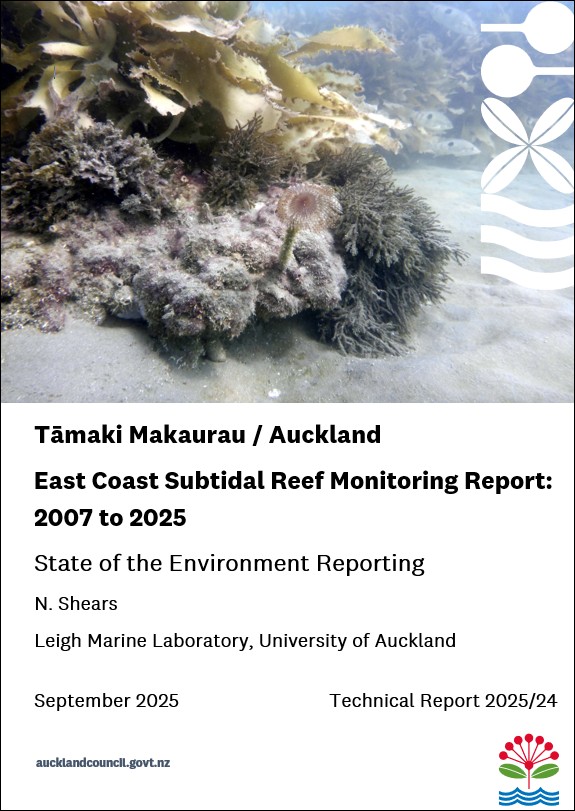 Monitoring of shallow subtidal reef sites at Meola Reef-Te Tokaroa (n=3) in the Waitematā Harbour, East Coast Bays-Whangaparāoa (ECB-WGP; n=19), and Leigh (n=4) in the outer Hauraki Gulf, has been carried out for Auckland Council since 2007. The reefs at Meola and ECB-WGP were historically characterised by dense macroalgal forests dominated by large fucoids (predominantly Carpophyllum species), with high numbers of gastropods, whereas sites at Leigh are typically dominated by the kelp Ecklonia radiata. Sampling across all 26 sites has been carried out on a biennial basis since 2019 and this report examines trends in key species and benthic covers across these locations from 2007-2025.