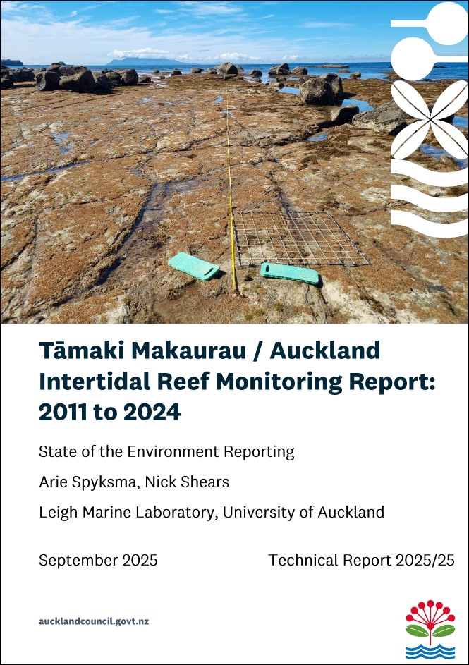 This report provides an assessment of rocky intertidal reef communities across the Auckland region, based on data collected from 22 long-term monitoring sites spanning Aotea / Great Barrier Island (GBI – east and west coast), the Mainland East Coast (MEC – outer to inner Hauraki Gulf), and the Mainland West Coast (MWC – open coast and Manukau Harbour) from 2011 to 2024. The monitoring programme captures regional and temporal variations in intertidal biodiversity and community structure and provides an evaluation of key environmental variables that may be driving change.